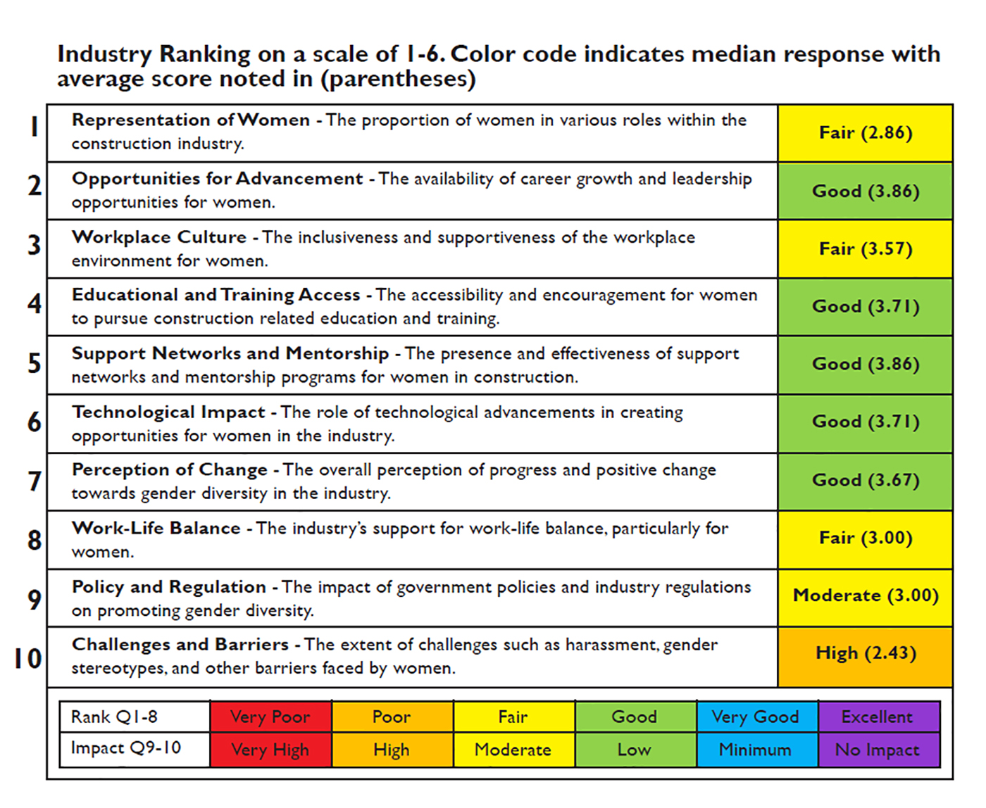 This women cohort, understanding the challenges and barriers ahead, is determined to overcome them. Their passion for design and construction and commitment to contributing to the built environment outweighs the possibility of a few bumps on the road they could face. In the survey, students ranked the industry in several areas, with opportunities for advancement and support, networking, and mentorships the highest. On the lower side, they ranked the representation of women and the challenges and barriers faced by women lowest.
