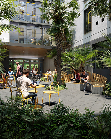 This approach not only yields the greatest number of beds, it also affords protection and respite for students from urban noise and activity. The courtyard oasis provides daylight access to units and a key opportunity to connect students with nature in an urban environment.