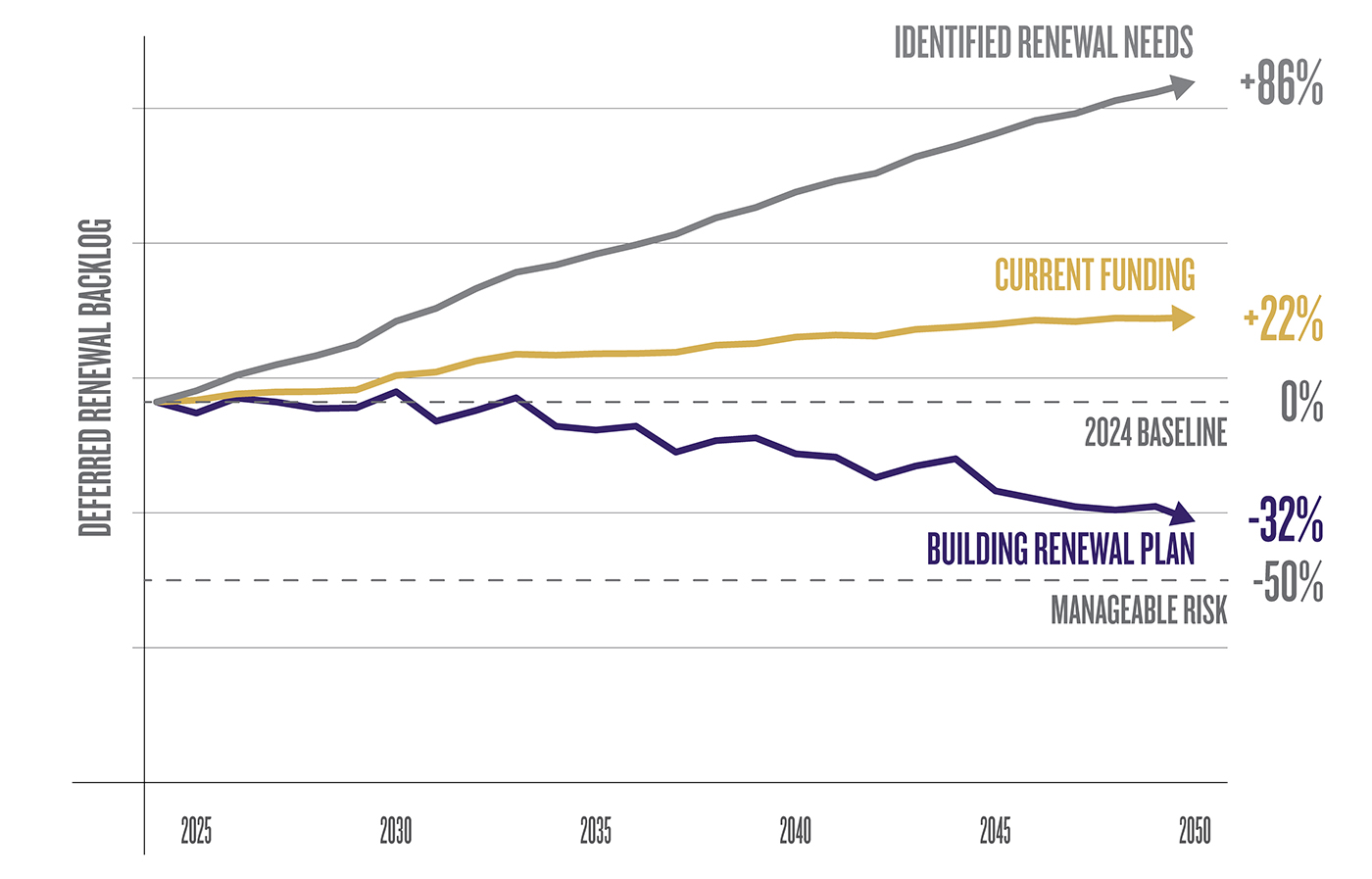 The tool outlines both 10-year and 25-year implementation strategies, with a longer-term goal: to significantly reduce UW’s deferred renewal risk by 2050. It’s a living plan updated regularly, and responsive to change.