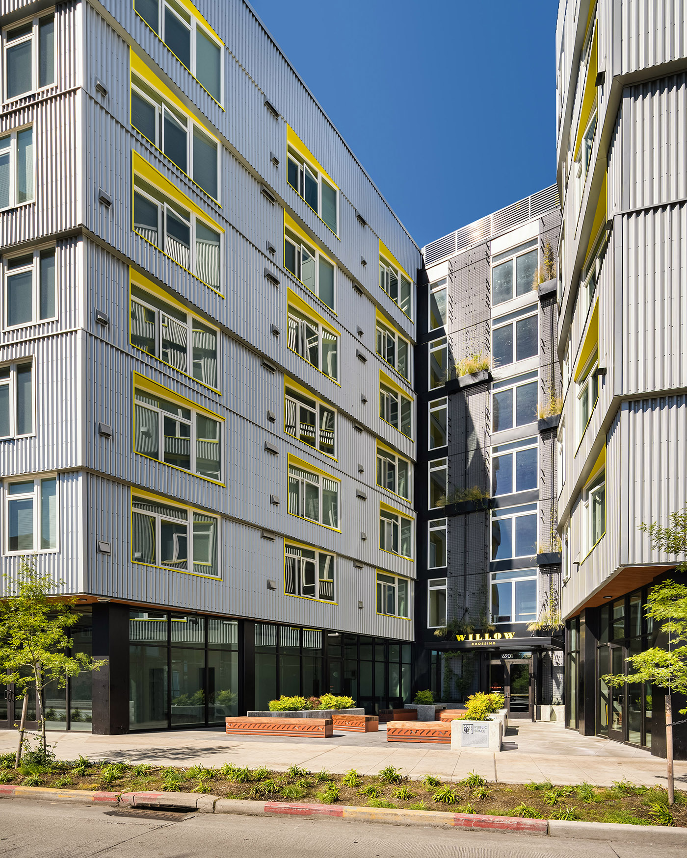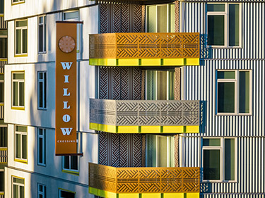 Willow Crossing was made possible through a combination of public financing tools, including tax-exempt bonds, local housing funds and support from nonprofit impact lenders. The development also involved a street vacation process, which allowed for more cohesive site planning and the creation of shared outdoor spaces.