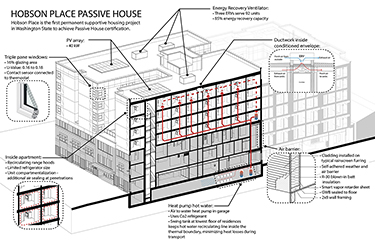 Hobson Place was awarded Ultra High Energy Efficiency (UHEE) funding from the Washington State Housing Trust Fund, as well as grants from Seattle City Light and the King County Housing Development Consortium’s Exemplary Building Program. These funding sources allowed greater up-front capital investment to improve building systems and construction techniques, including installation of all-electric plumbing and mechanical systems.