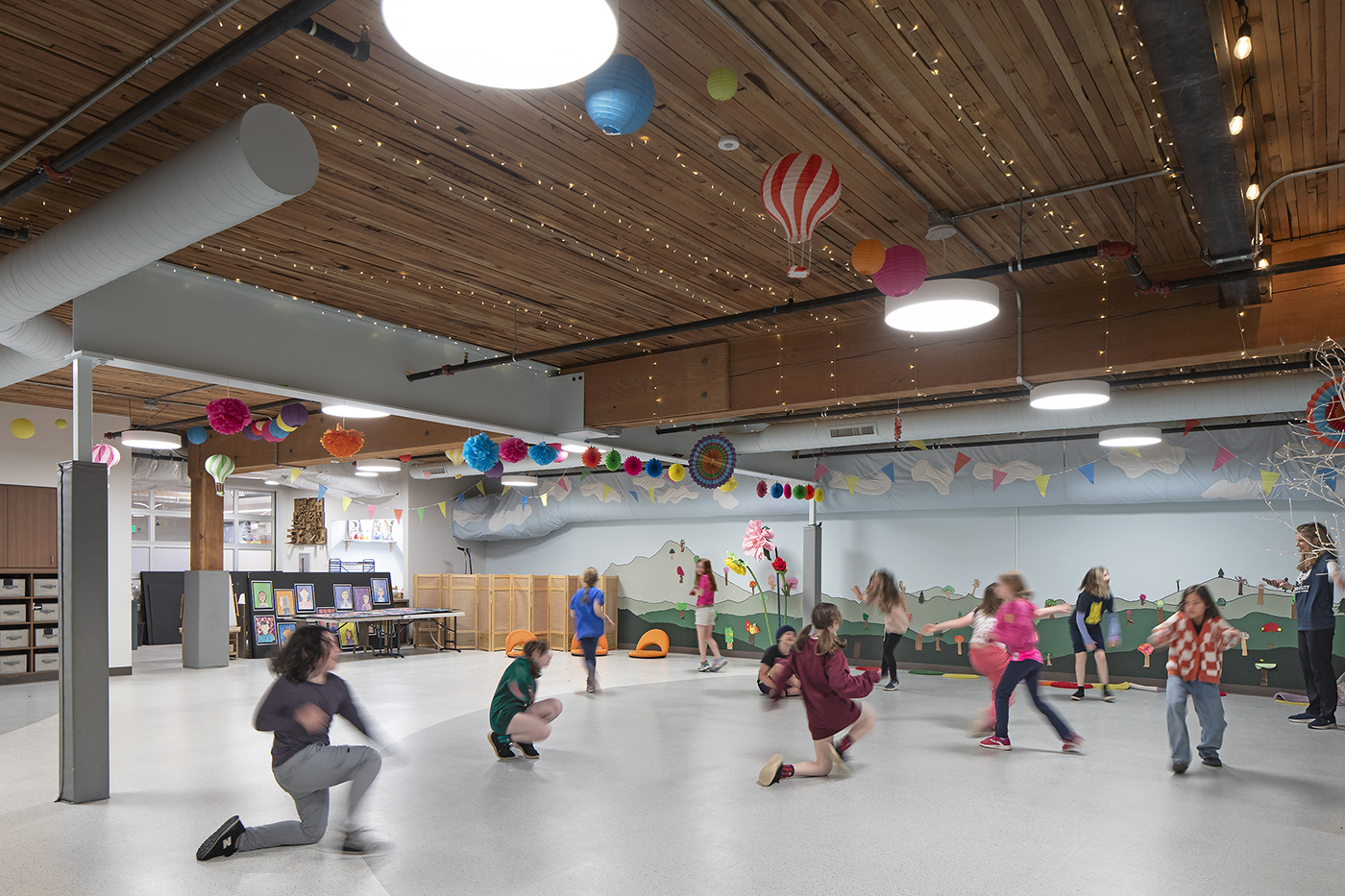 The renovation of the final portion of the lower level marked the expansion of UCoop’s Early Learning Center, further extending its pre-K offerings. The phase also added a maker space, counseling offices, additional staff space, and student and adult restrooms. The robust gang-nailed floor structure, once supporting cars, was sandblasted and exposed as a striking architectural element.