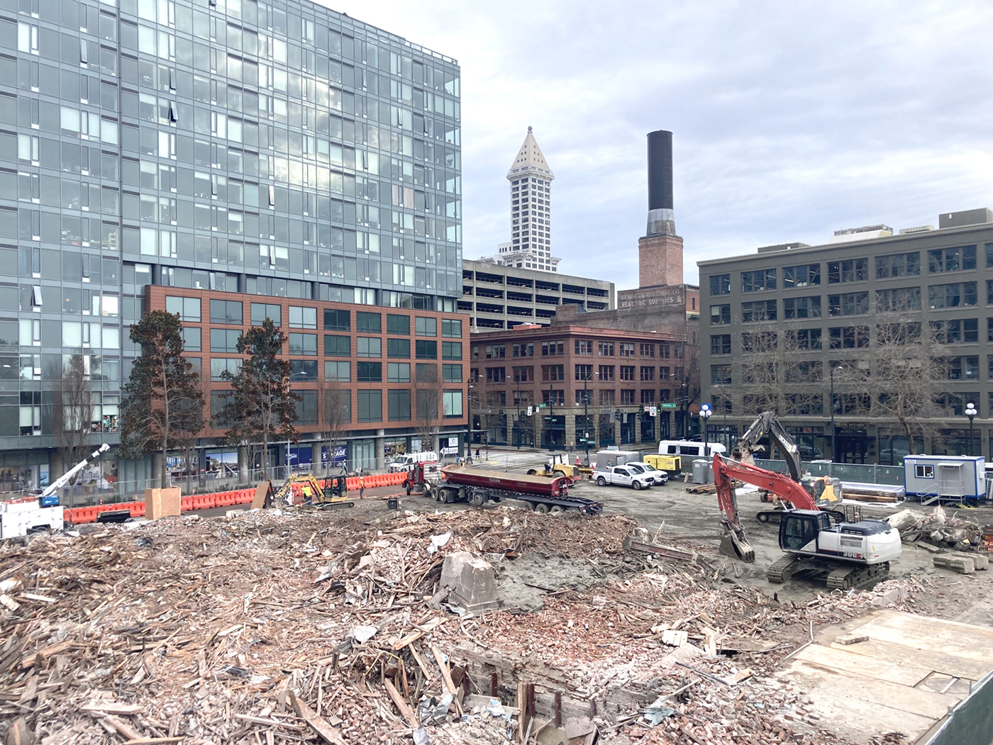 After that, who knows what will come next for this block? For now, nearby workers (again, me) have unobstructed office views of the Olympic Mountains and the ferries making their way across the sound. Visitors to our sparkly new waterfront can see more of the Smith Tower. And curious souls can walk across the Marion Street pedestrian bridge, peer into the great morass of building materials, and wonder.