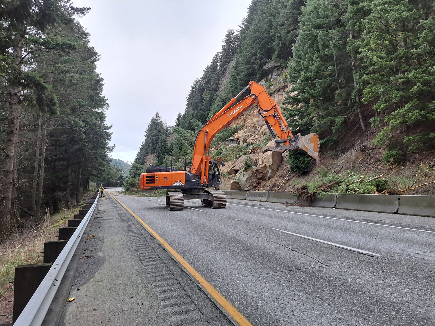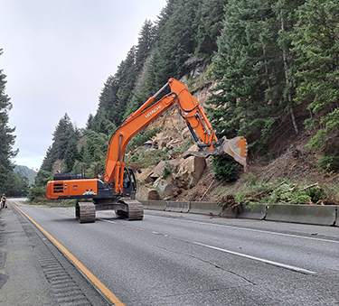 Washington State Department of Transportation contractor Interwest Construction started emergency work Sunday clearing northbound Interstate 5 south of Bellingham after landslides sent thousands of cubic yards of boulders, trees and other debris across the freeway Thursday night.