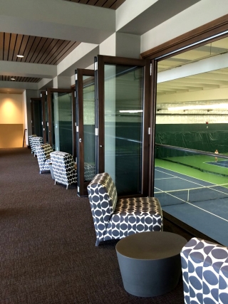 The two-story, 4,900-square-foot pro shop is adjacent to the indoor-court building. It's more than twice the size of the single-story pro shop it replaced. The new building also houses a lobby, coffee bar, viewing areas for the indoor courts, offices, restrooms, and a spacious rooftop terrace that overlooks eight of the 13 outdoor courts.