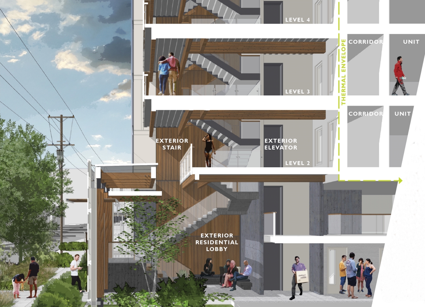 The exterior sheathing joints will be taped to reduce air leakage, saving energy by limiting the amount of conditioned air that is lost. The building's elevator and central stair will be outside of the building to reduce the amount of interior space that needs to be conditioned.