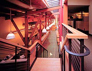 The 24,000-square-foot building has one of the region's first installations of certified wood. Non- or low-toxic finishes are used throughout and a number of recycled-content materials are included such as insulation, drywall, acoustical tile and partitions. The exterior is painted fiber cement siding. Skylights and an open office plan make the most of natural light and ventilation.