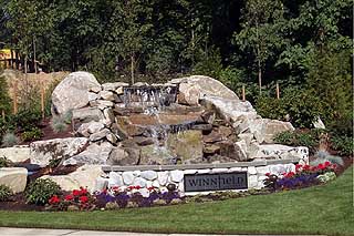 The entrance to the site features a cascading waterfall that abuts natural open space. A walking trail and footbridge cross a wetland to a nearby city-owned park. On the opposite side of the entrance is a full-size tennis court placed on top of an underground stormwater detention vault. Narrow, winding streets are another amenity, adding to the pedestrian feel of the neighborhood.