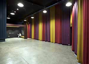Large windows, installed to create a sense of connection between the theater and the street, allow passers-by to see into the theater.