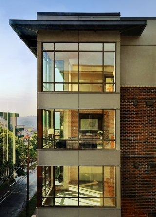 A masonry exterior was used to visually connect Duncan Place with the brick architecture found on the nearby University of Washington campus. The building has corner glass towers and a series of large tuck-in balconies.