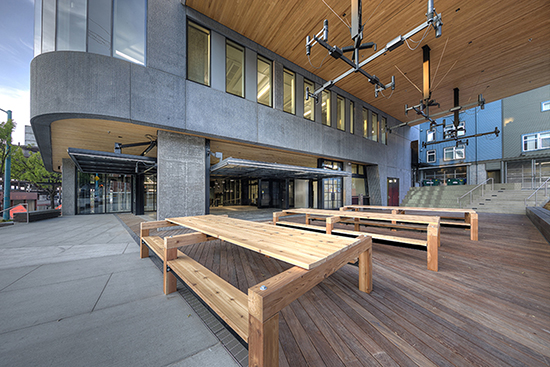 A large open space at the south end offers open-air seating and hinged garage-like doors. Paving has been embedded with salvaged tree grates.