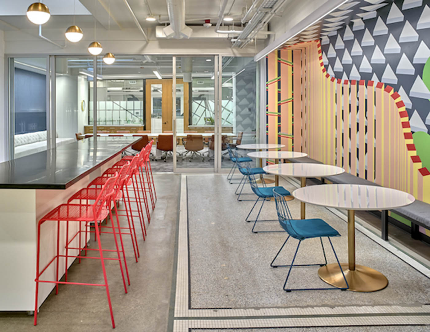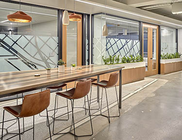 An open kitchen was designed as a center hub for the office, with a mural by a local artist. Two old skylights were cleared, and a third was added.