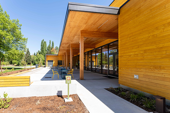 Inspired by the nearby Sammamish River, the center’s design employs biophilic architecture to connect visitors with nature. Expansive wooden elements are exposed in the interior and exterior to create a warm and inviting atmosphere.