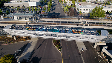 The Northeast Eighth Street Bridge is a new pedestrian and bicycle overpass in central Bellevue, providing a critical crossing over one of the busiest streets on the Eastside.