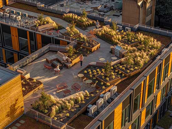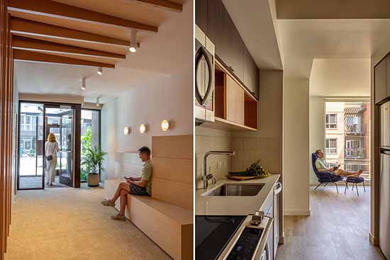 Resident amenities include a planted courtyard, a rooftop deck, a community room, below-grade parking garage equipped with EV charging, bike storage room to cater to the neighborhood’s cycling culture, and pet-friendly spaces.