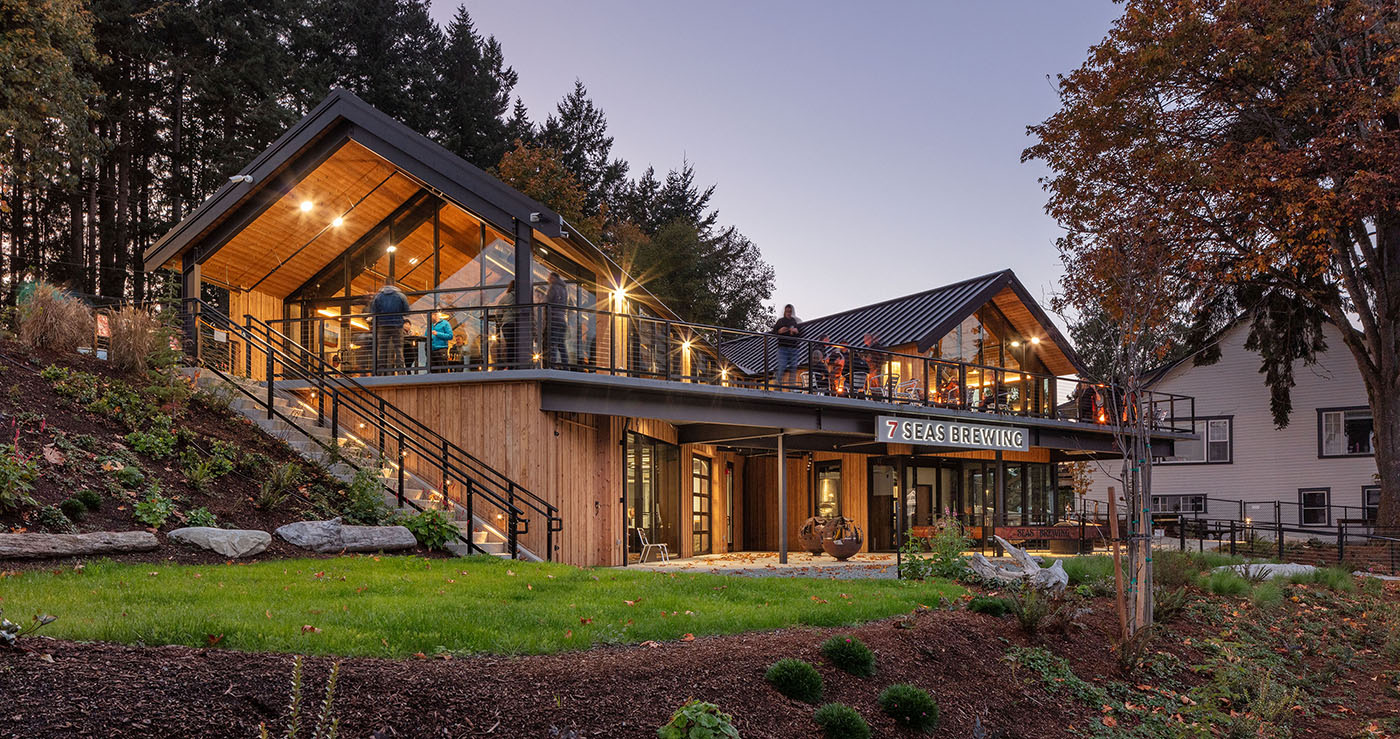 7 Seas Waterfront Taproom sits on the shores of Gig Harbor, a little north of the Tacoma Narrows Bridge, and is accessible by both land and water.