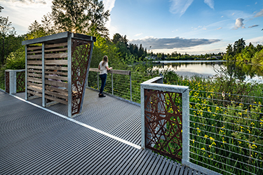 Wetland buffer trails have seating and lean rails, and an elevated boardwalk takes visitors over sensitive areas. There’s a bird blind and lake viewing shelter, lake edge seat walls and gathering spaces.
