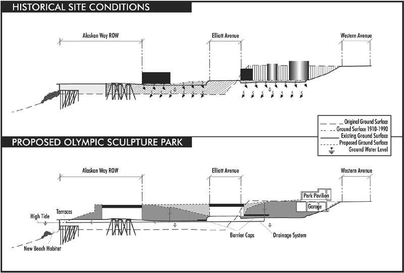 8. In the 1990s, site remediation efforts began. Magnusson Klemencic assisted the environmental cleanup team by designing a means to remove tons of contaminated soil. At that time, a ground water cleansing system was also installed. Restoring nature And so we come to the ninth major land alteration on this site: the Olympic Sculpture Park. This time, a positive environmental agenda combined with a sustainable site engineering strategy will roll back the negative environmental impacts of the last 120 years. The final cleanup. The strategy begins at the existing surface. Contaminated soils that could not be reached during the previous remediation efforts still underlie the site in some areas. When surface water is allowed to percolate through these pockets of soil, petroleum products can be carried into the ground water beneath. To stop this migration, barrier caps constructed of asphalt pavement and lean concrete — and in some areas the earth fill itself — will be placed on the site prior to fill activities. Restoring the bluff. The importation of over 200,000 cubic yards of fill to rebuild the hillside will sculpt the site, in keeping with the architectural and landscape vision — and nature’s priorities. The massive fill operation will restore natural topography while respecting existing infrastructure. A continuous plane of ground will be created from Western Avenue to the seawall, restoring lost views to humans and wildlife, improving sun angles for plants and creating pedestrian access. Fifty thousand square feet of mechanically stabilized earth will hold back the fill, allowing Elliott Avenue and the BNSF rail lines to slice through this plane. Bringing back the beach. A new beach and shoreline habitat area will be created at the junction of the sculpture park and Myrtle Edwards Park. By removing material placed 40 years ago, the original tidelands will be unearthed, and a sand beach will once again commingle with newly accessible tide pools. A series of terraces leading into this new shoreline area will be excavated behind the seawall. These terraces will provide an enticing habitat for a wide variety of marine creatures. Runoff rollback. Ironically, this site immediately adjacent to the shoreline has not delivered storm drainage runoff to Elliott Bay for decades. Rather, rainfall landing on the site has been combined with sewage and conveyed to the West Point Sewage Plant 6 miles away.