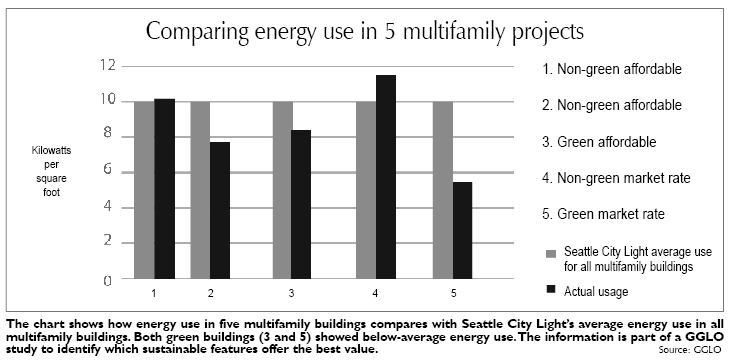 Source: GGLO The chart shows how energy use in five multifamily buildings compares with Seattle City Light’s average energy use in all multifamily buildings. Both green buildings (3 and 5) showed below-average energy use. The information is part of a GGLO study to identify which sustainable features offer the best value.