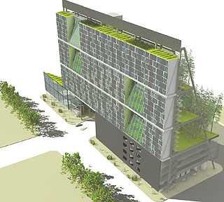 Energy and water. The building would have about 35,000 square feet of photovoltaic cells. Rainwater is captured, filtered and stored through multiple levels of planters, terraces and gardens.