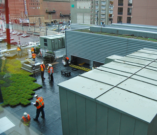 Olive 8 actually has two green roofs. The smaller one, at about 2,500 square feet, is on top of the chillers and is sod-based. The larger roof, at about 5,800 square feet, is made up of trays that hold smaller sections of the green roof.