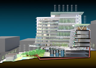 Weber Thompson developed this conceptual design for Eco-Laboratory, a Belltown apartment building with a vertical farm. |