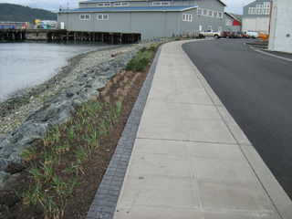Partnering with the Skagit Marine Resource Committee, the port incorporated low-impact development elements into the project, including permeable pavers in the parking area along the street. Stormwater flows through the pavers and into the soil. A concrete accent band edges the pavers, providing extra stability. An interpretive sign explaining the LID projects and how they positively affect the environment is located along the sidewalk.