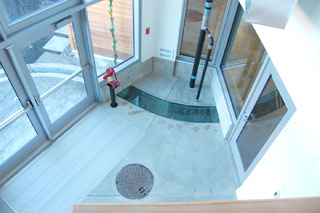 There are two underground cisterns. One is for site irrigation and will collect water from the classroom's moss-mat roof. The other cistern will be filled with water from the roof of an adjacent campus building and the classroom's butterfly roof. That water will flow into the science classroom through downspouts and pass through an exposed runnel in the floor, through the classroom and into the greenhouse.