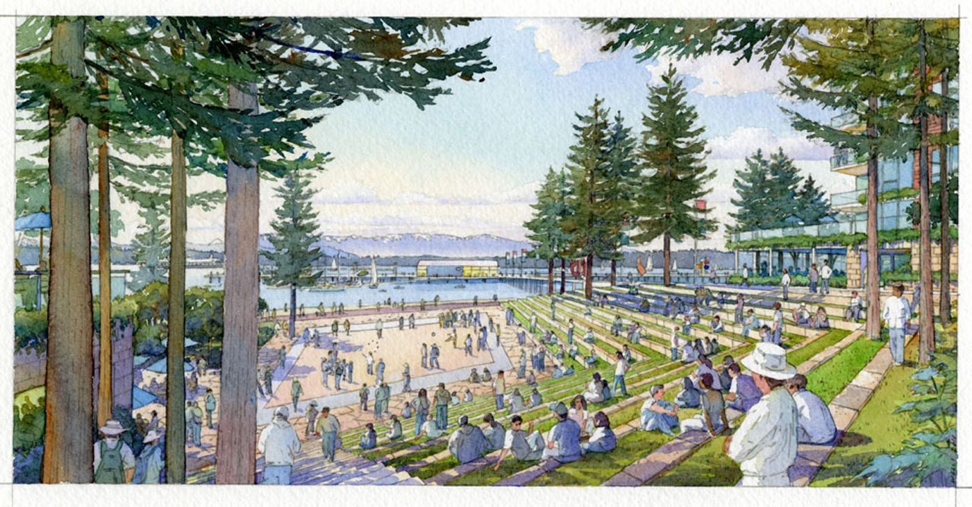 The developer has planned a multitude of amenities for residents and guests, including a community center, boardwalk and bike trail, a public transportation hub (including a possible Sounder station), and a large beach plaza and amphitheater. There would also be P-patch opportunities, abundant open space and wetlands.