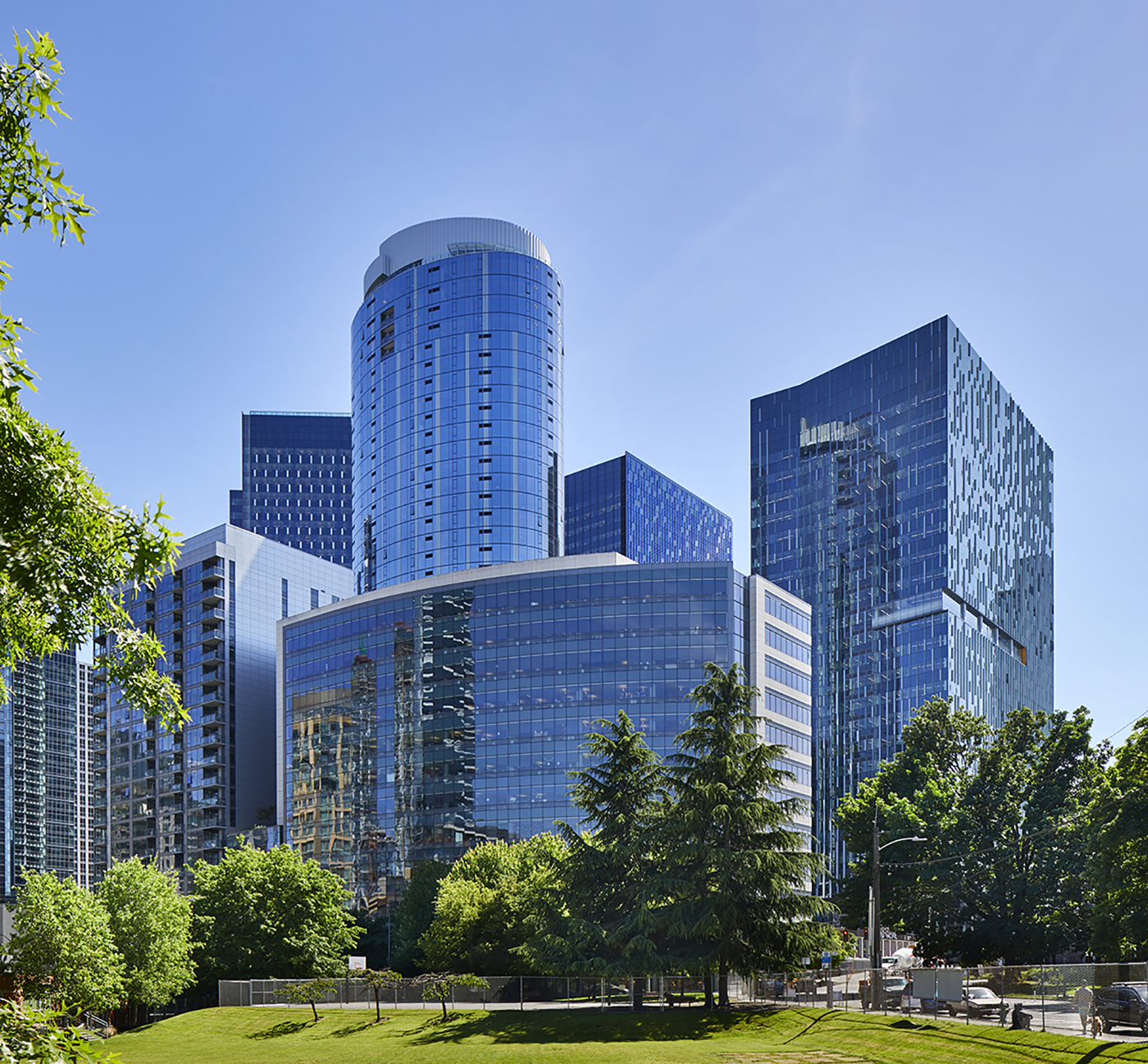 The revitalization of Seattle’s Denny regrade neighborhood employed vertical density to increase overall site utilization and reduce the amount of area required to house these functions as compared to horizontal, single-use models where each program element may be in an individual building. Building mechanical elements are consolidated within the subterranean garages and rooftops, freeing up the ground plane for open space, circulation and active uses, while the towers above maintain high efficiency and program flexibility. The result is the ability to fit more value within a smaller container, doing more with less.