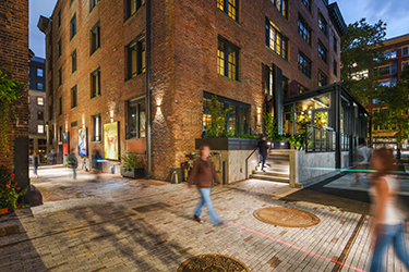 At the neighborhood scale, the project reconnects Pioneer Square’s historic RailSpur corridor, a former rail line that once linked industrial loading docks. Through thoughtful architectural and structural moves like the dining enclosure atop a transformer vault, the building now opens onto this corridor through a sequence of interior and exterior spaces, including the skygarden, alley restaurant, and rooftop destinations. These moves introduce pedestrian connections through the site and contribute to the reactivation of long-neglected urban passageways.