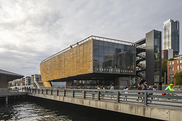 Because of this, Turner Construction is collaborating with organizations such as the Rainforest Alliance, the Climate Smart Wood Group, and other design firms to develop a strategy to eliminate the use of non-certified tropical hardwoods and promote alternative exterior material solutions, like those used at the Seattle Aquarium.