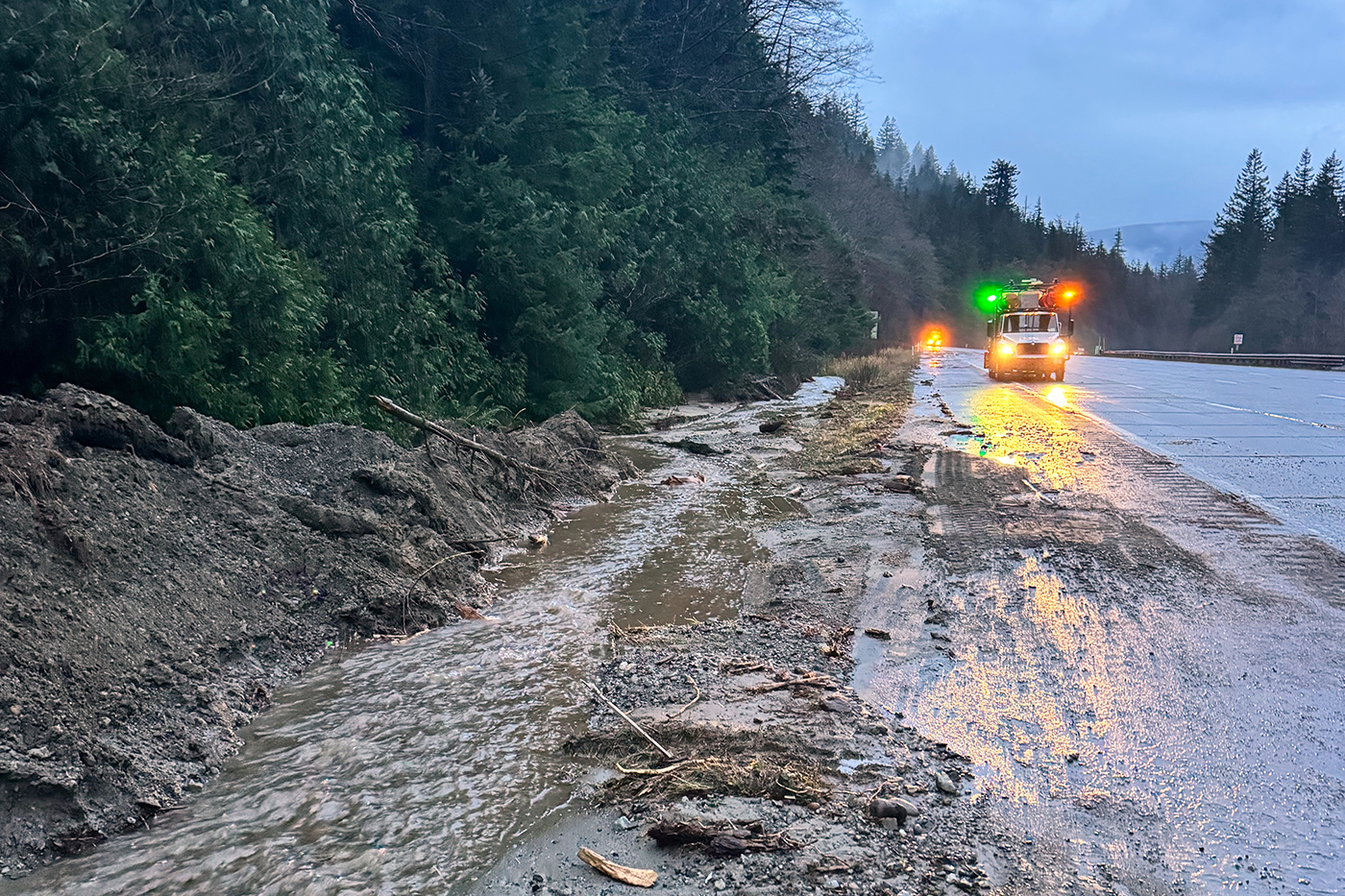 This WSDOT photo shows debris on Interstate 90 from a rainstorm Tuesday.