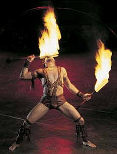 An "Alegria" cast member performs a ritual dance, weaving baton-like fire knives around his body. The Cirque du Soleil production opened yesterday in Renton.