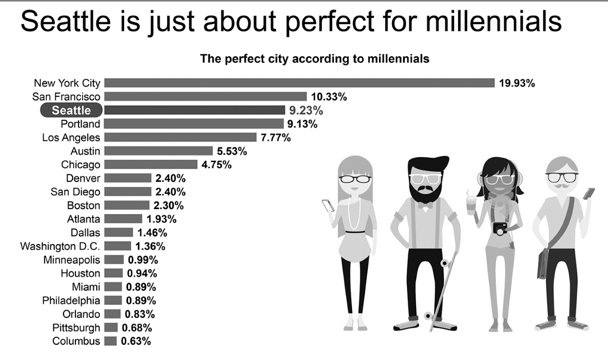 Broker JLL, in conjunction with Abodo.com, released survey results this week that rank Seattle as the third best city for millennials. There were 2,000 respondents and they placed New York and San Francisco ahead of us. Only opinions were solicited, not detailed data. Nearly 20 percent of those asked said they preferred New York. San Francisco earned a 10 percent thumbs up, while Seattle and Portland are essentially tied — at 9.23 percent and 9.13 percent, respectively. Columbus, Ohio ranked last among the 20 cities cited.