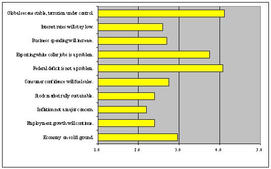 University of Washington What a difference a year makes. Last year at this time, I wrote an article for the Daily Journal of Commerce entitled “Seattle's Economy: Out of Sync?” The basic theme of that article was that we should give some careful thought regarding what to do to get our local economy in sync with the broader national economy, assuming we could agree that we cared about our relative performance. As it turns out, the question was somewhat moot, given the fact that the U.S. economy struggled throughout much of the year. However, by the end of the summer, the economy did manage to avoid slipping back into recession, setting fears of deflation behind us. Over the past several months, the stars continued to line up, suggesting that the national economy would emerge from the doldrums. Evidence of this reversal of fortunes is fairly widespread, with the stock market gaining ground and business confidence picking up. This can be attributed to a number of factors, including low interest rates and some aggressive actions out of Washington to stimulate consumer spending and business investment. Given the economic revival, as we go into 2004 the question of our relative role takes on a more urgent tone since there is a danger of standing out as a sub-performing market. Whether we catch the train of recovery or are left back at the station is an important question, given the importance of external capital flows to support our economy, and the dependence of such flows on transparency and perceptions. I conduct surveys of local professionals regarding the economy, the real estate market and the issues/opportunities faced by our region. My comments here are based on the results of our latest survey, which included responses from over 60 local business professionals.