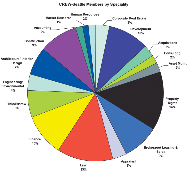 That groundwork has led to the success of today’s CREW Seattle chapter in both breadth and depth, as the next generation has entered the commercial real estate profession in ever increasing numbers. CREW Seattle has added nearly 100 members in the last three years, now nearing 300 members, representing all facets of the industry. The chapter has seen strong growth by members specializing in construction and engineering as well as the heart of the industry: development. Those involved with financing, title, escrow and the legal aspects of a real estate transaction still make up a large part and the traditional strength of Seattle’s membership in CREW. Nationally, CREW Network represents a well-educated and experienced group of 6,000 professionals, with international membership that includes all disciplines of commercial real estate every expert required to “do the deal.” Here are some interesting tidbits: