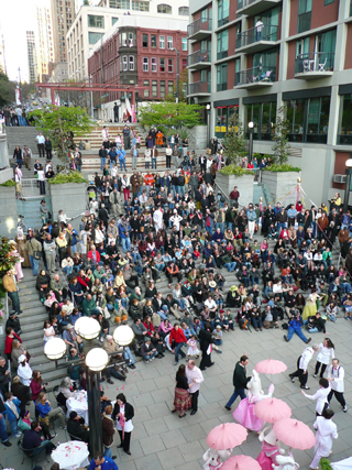 This free outdoor performance served as a reminder that Seattle has a shortage of downtown open spaces. The Seattle Parks Department’s 2006 gap report states that 21 acres of open space have to be added in the city by 2024 to meet the needs of projected numbers of residents and workers. To support urban density and attract residents, Seattle needs more open spaces that will make our downtown healthy and vibrant. As our own city’s downtown core transitions from a primarily commercial environment to one with 10,000 new households in the next 15 years, creating places that foster community is critical to the city’s vision of a livable downtown.