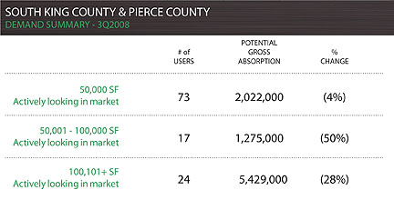 Market demand/absorption Through the first nine months of 2008, a total of 1.70 million square feet of net absorption was completed, with activity trending downward. This was slightly lower than the pace set in 2007, which totaled nearly 2.26 million square feet by the third quarter. For 2007, total net absorption was 4.57 million square feet with tremendous leasing activity in the fourth quarter. That is not expected again this fourth quarter. However, some notable lease signings occurred in the third quarter, such as United Natural Foods for 342,000 square feet in Auburn (renewal and expansion of 187,872 square feet), Puget Sound International renewing for 106,000 square feet in Tacoma and Chasing Fireflies signing up for 75,000 square feet in Tukwila. Net absorption at the end of this year’s third quarter for South Seattle, the Southend and Pierce County was 1.71 million square feet. That compares to about 4.57 million square feet for the fourth quarters of both 2006 and 2007. So, what exactly is going on? Well, demand is finally waning.