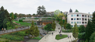 The new park is envisioned as a restorative place where visitors recreate and reconnect with the historical, natural and cultural landscape. Located downtown, a short stroll from shopping malls, high-rise office towers, upscale residential towers and the city’s original Main Street, the public park will attract visitors of varied interests and ages serving nearby neighborhoods as well as the broader community. In addition to improving public access to the water and increasing recreational opportunities, the plan includes several recommendations to restore the site’s ecology. The master plan proposes to partially remove shoreline structures and restore shoreline vegetation, daylight a creek, reforest the hillside, remove invasive species and reduce overwater shading to improve fish habitat. The plan also recommends sustainable development strategies, including the use of bioswales, permeable pavements, native plants, local building materials and green building technologies. The steep terrain accommodates stacked uses such as underground parking, buildings tucked into hillsides, and rooftops with overlooks and public spaces.