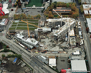 Construction of the entire campus spanned more than four years. Included were a 1,050-car, five-level underground parking garage completed in 2008, followed by two office buildings totaling 525,000 square feet over the top of a two-level parking structure with an outdoor plaza as the centerpiece.