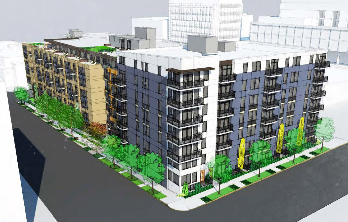 Units will be a mix of studios, open one-bedroom, and one- and two-bedrooms. Some will be at street level, with stoops and gated entries to create a buffer from the street.