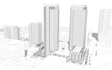 The towers will sit on a retail podium with 44,000 square feet, and there will be approximately 1,900 underground parking spaces. The project represents nearly one-third of all housing units planned in the neighborhood.