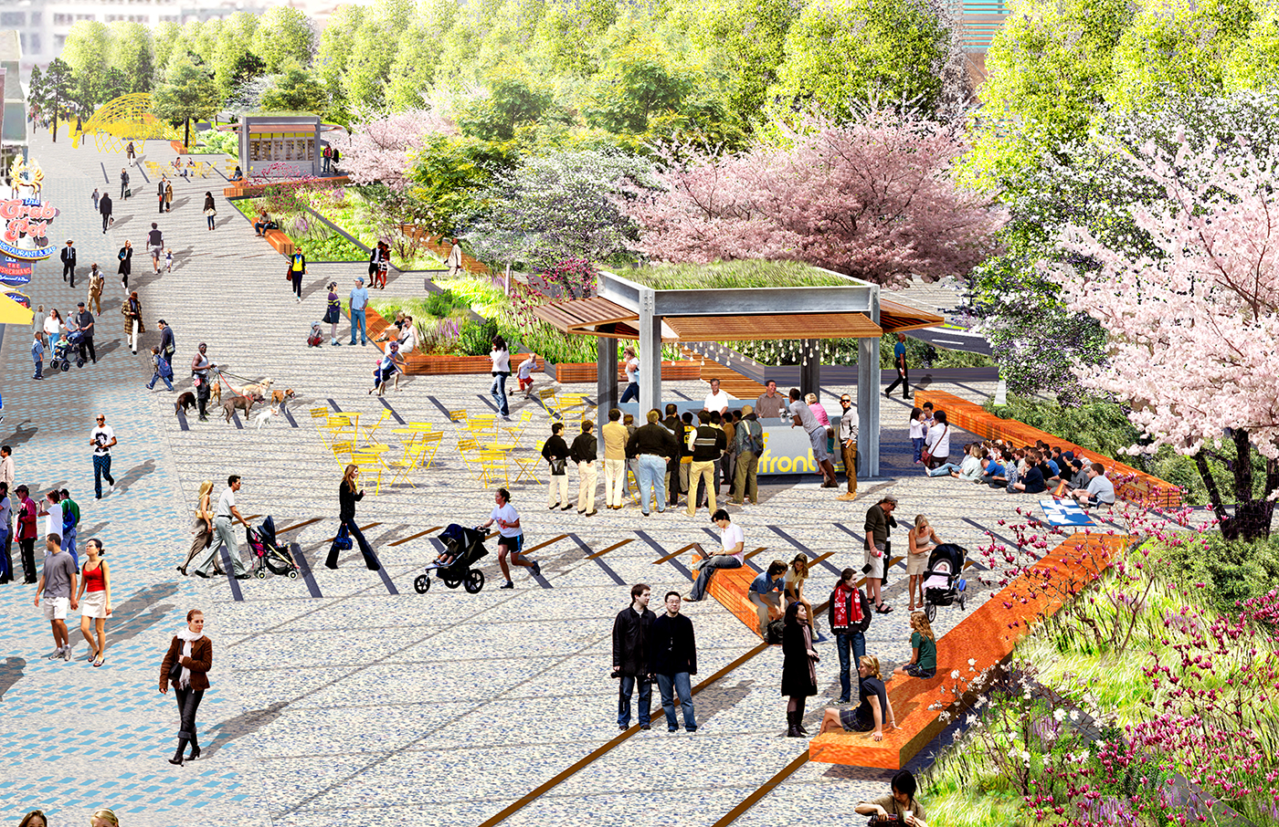 The city hired James Corner Field Operations of New York to lead the design team for the new waterfront, which will connect to downtown and encourage pedestrians with wide sidewalks, trees and plantings, parks and public spaces, and maybe even a pool on a barge. A waterfront promenade would run along the new Alaskan Way.