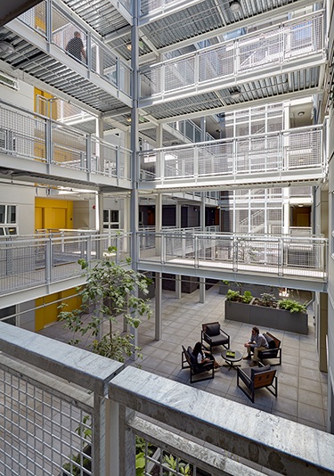 The building is organized around an open-air interior courtyard designed to let units receive lots of natural light and allow for passive cooling. Without interior hallways, the building has no need for mechanically conditioned corridors and common areas.