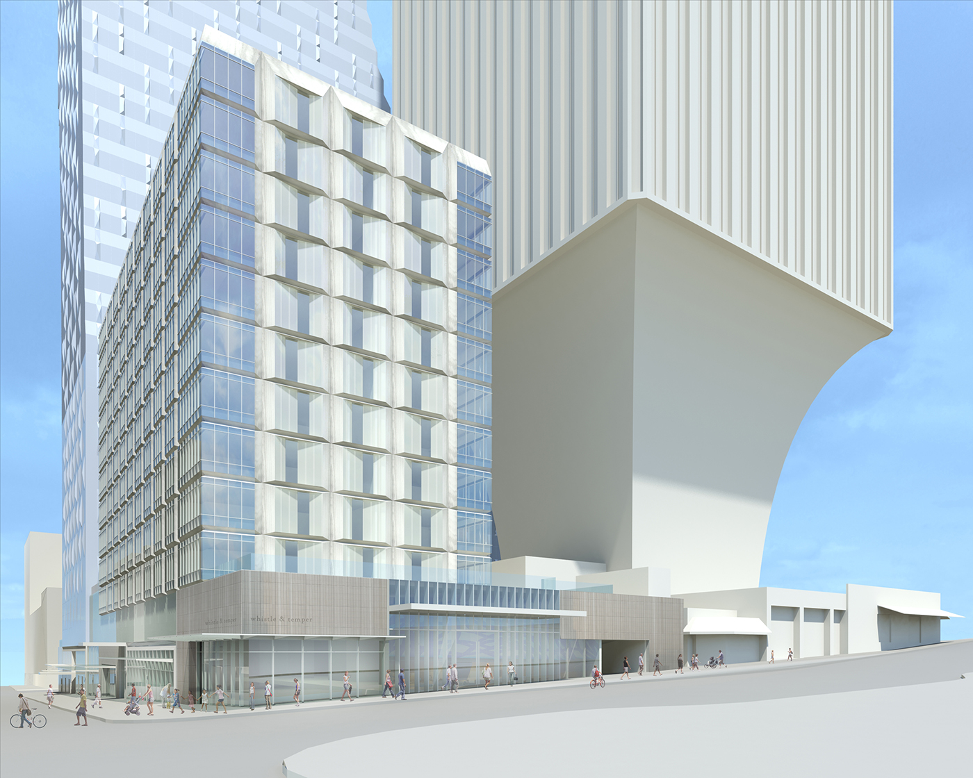 The proposed hotel has been moved back about 25 feet from the sidewalk to make room for pedestrians and make the existing Rainier Tower more visible.