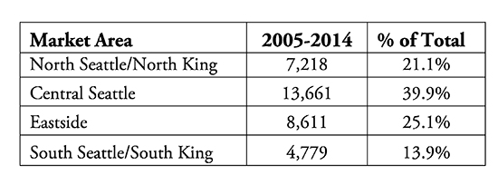When we look back on the development history of apartments over the past 10 years we can see that the central Seattle market area has brought online almost 40 percent of total new supply. This is not surprising as lack of infrastructure development (think long commutes), together with demographic shifts, created demand for downtown dwellings.