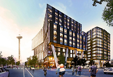 The south tower would be the “active” one. A concave shape on the south side would allow for a public plaza and views of the Space Needle.