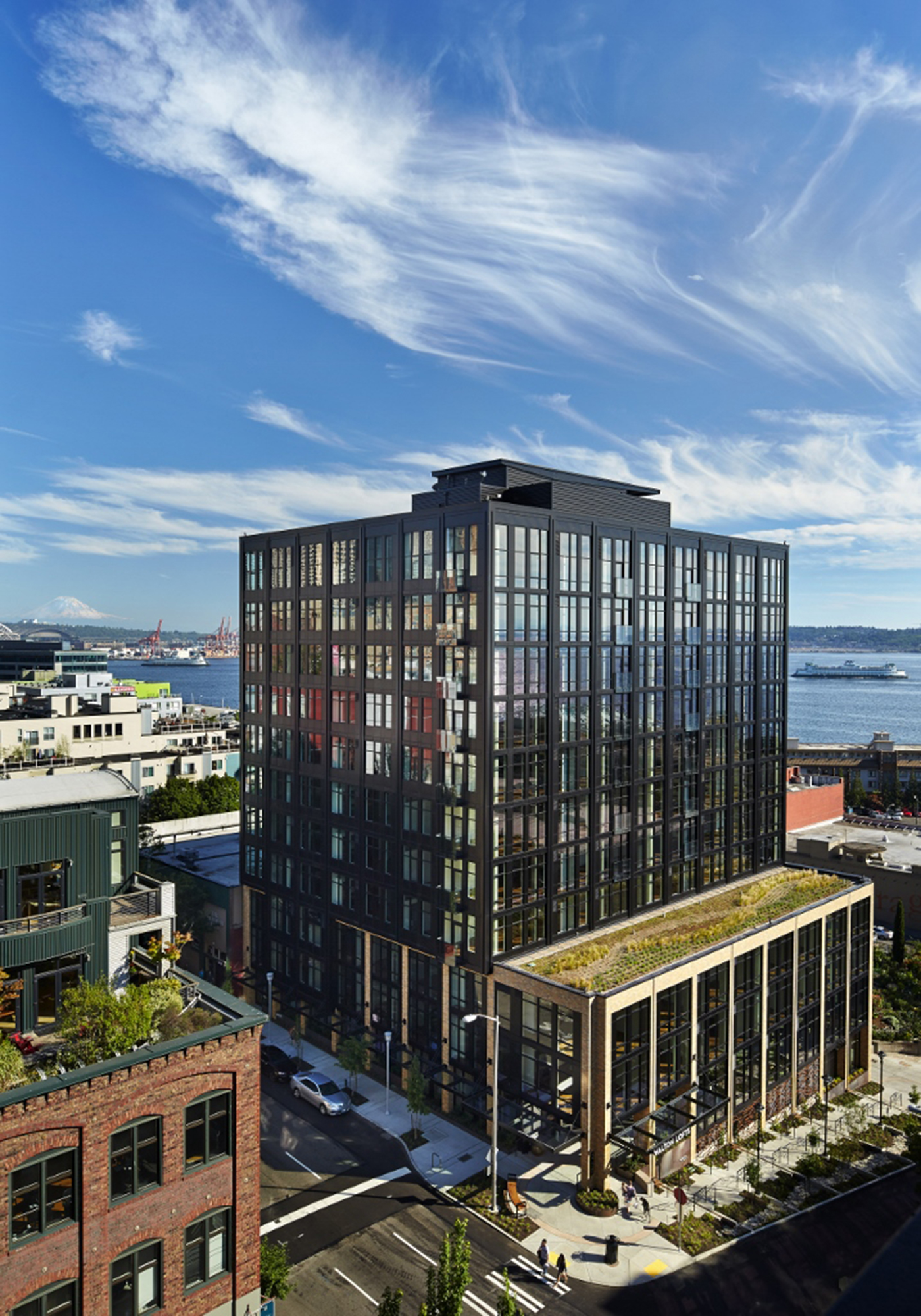 Walton Lofts includes a system of runnels and weirs that capture rainwater from the roof, filter it through a green roof on the fifth floor, and move it through runnels on the exterior of the building to Vine Street. Water pours from a sculpture into the weir system where it is filtered before going into Puget Sound.