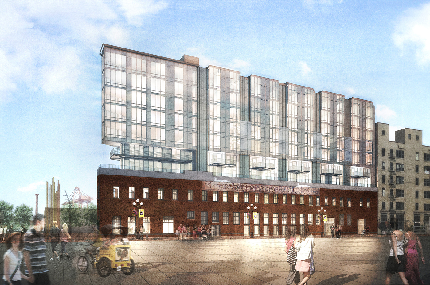 Daniels will add seven levels of housing plus a rooftop amenity deck to the century-old Seattle Plumbing Supply building. The ground floor and mezzanine level will have 9,700 square feet for separate restaurant and bar spaces.